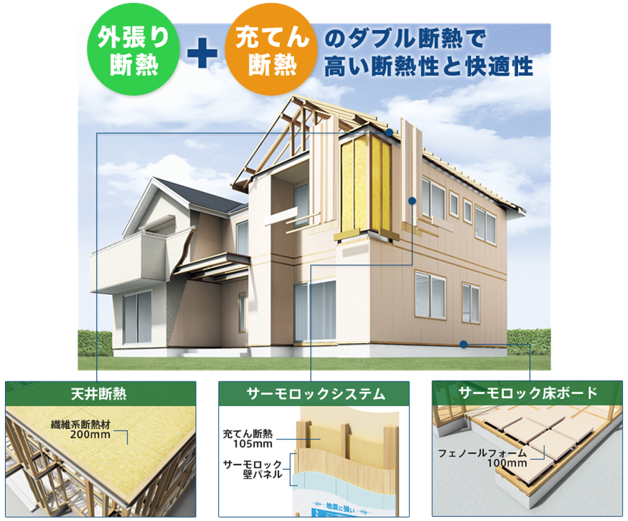 「外張り断熱」に加え、壁の中にも断熱材を充填するダブル断熱で、北海道の省エネルギー基準において断熱等性能等級4を実現する「サーモロック」。