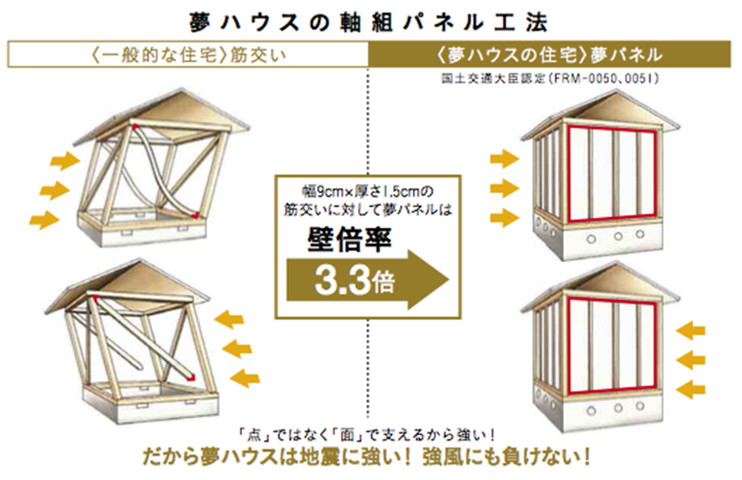 筋交いだけの木造軸組工法では耐震性に不安があり、パネル工法の元となる2×4工法では間取りの自由度が低いのが欠点でした。