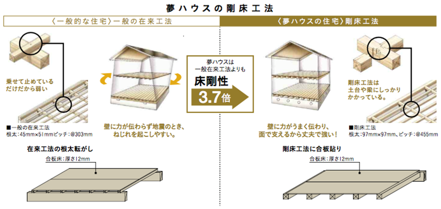 モアプランではパネル工法を採用することで耐震性もアップしているのですが、さらに耐震性を高めるため一般在来工法の3.7倍の強度がある剛床工法になっています。