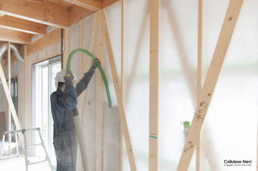 セルロースファイバーとは、木質繊維を使用して製造された断熱材で、断熱材としての性能はグラスウール24k・32kに相当する優れものです。