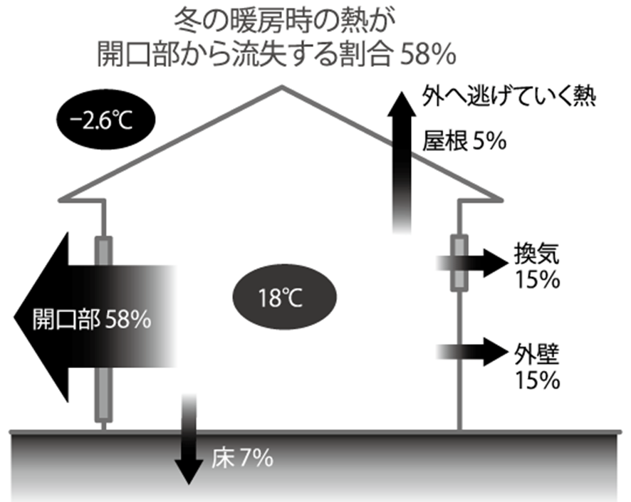 室内から外に逃げていく熱の58%が窓からだと言われていますので、多少費用をかけてでも性能が高い窓サッシを設置することをお薦めします。