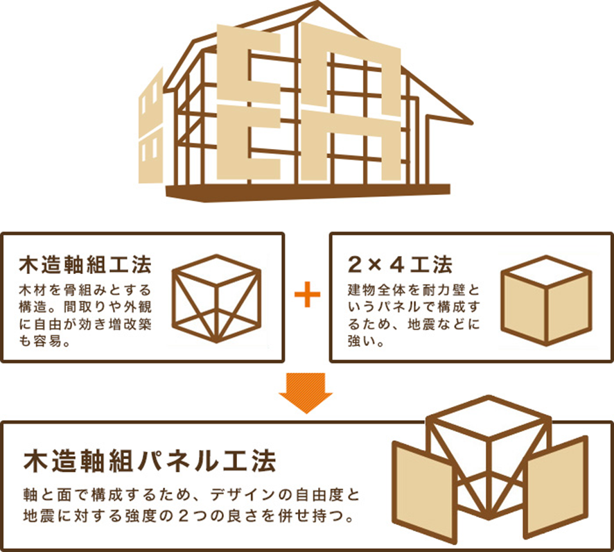 それら木造軸組と2×4の長所を取り入れて誕生したのが、耐震性や間取りの自由度が向上した木造軸組パネル工法です。